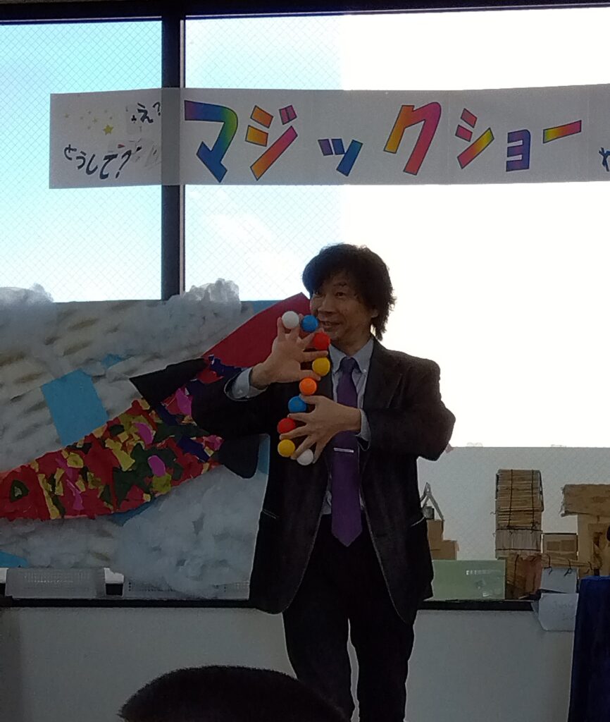 ハンカチからピンポン玉が出たり、きえたり、色が変わったりするマジックから始まりました。半信半疑で見ていた子どもたちも、次第に引き込まれていき、「なんで?」「ほんとかな?」という声があちこちから聞こえてきました。