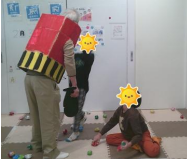 段ボールで鬼の体を作りスタッフが入り鬼の役目をし、子どもたちは豆の代わりに新聞紙を丸めた紙の玉を鬼に投げつけます。「悪い子はいないか~」「おには~そと」「おには~そと」。子どもたちが思いきり玉を投げつけた結果、ついに鬼は退散しました。